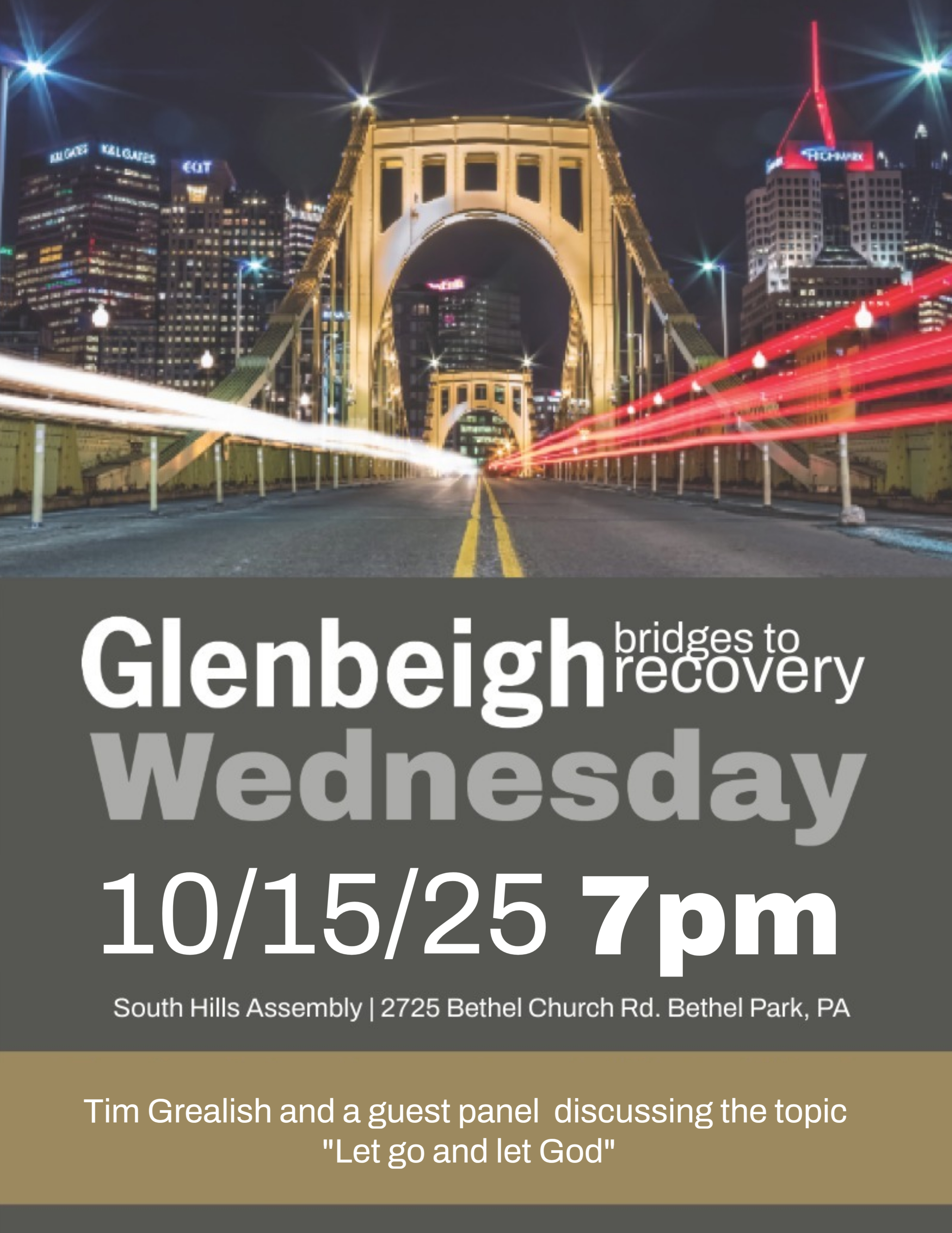 Anyone in recovery, or who loves or supports someone in recovery, are welcome to attend Glenbeigh's Bridges to Recovery meeting at 7:00 PM, Wednesday, October 15th, 2025. Various speakers will share on the topic of "Let Go and Let God". Event is hosted by Tim Grealish.