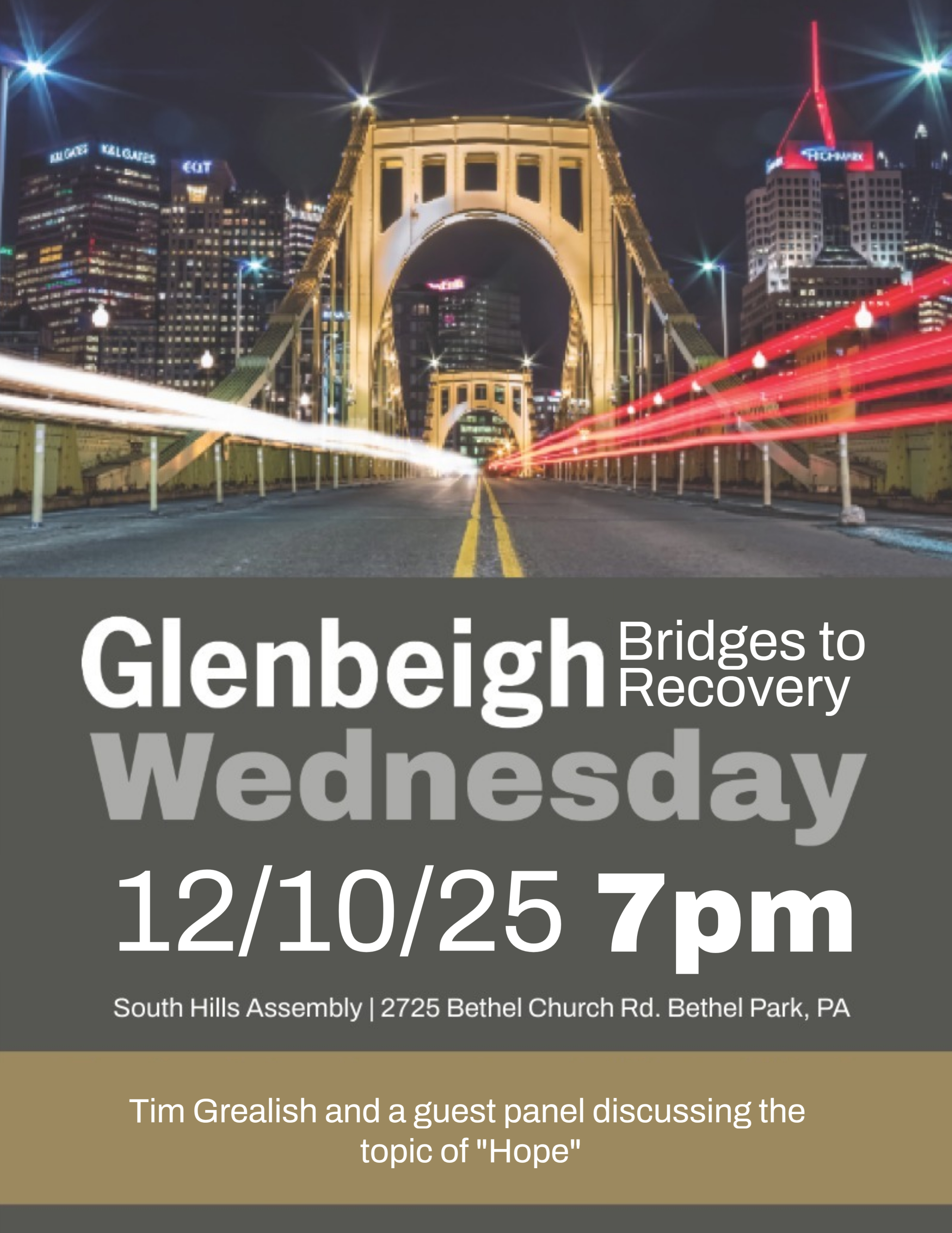 Anyone in recovery, or who loves or supports someone in recovery, are welcome to attend Glenbeigh's Bridges to Recovery meeting at 7:00 PM, Wednesday, December 10th, 2025. Various speakers will share on the topic of "Hope". Event is hosted by Tim Grealish.