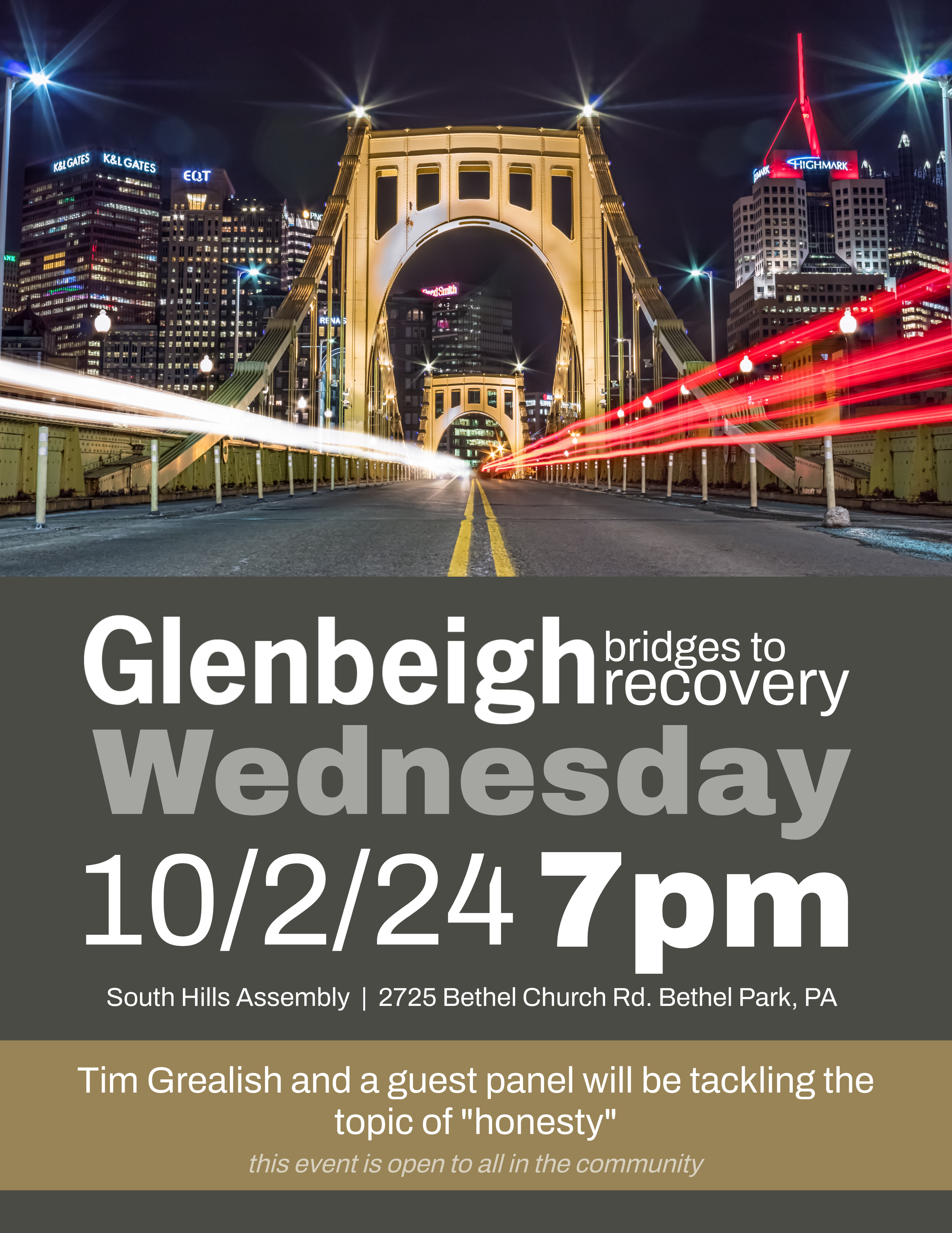 Anyone in recovery, or who loves or supports someone in recovery, are welcome to attend Glenbeigh's Bridges to Recovery meeting at 7:00 PM on Wednesday, October 2, 2024. Various speakers will share on the topic of "Honesty". Hosted by Tim Grealish.